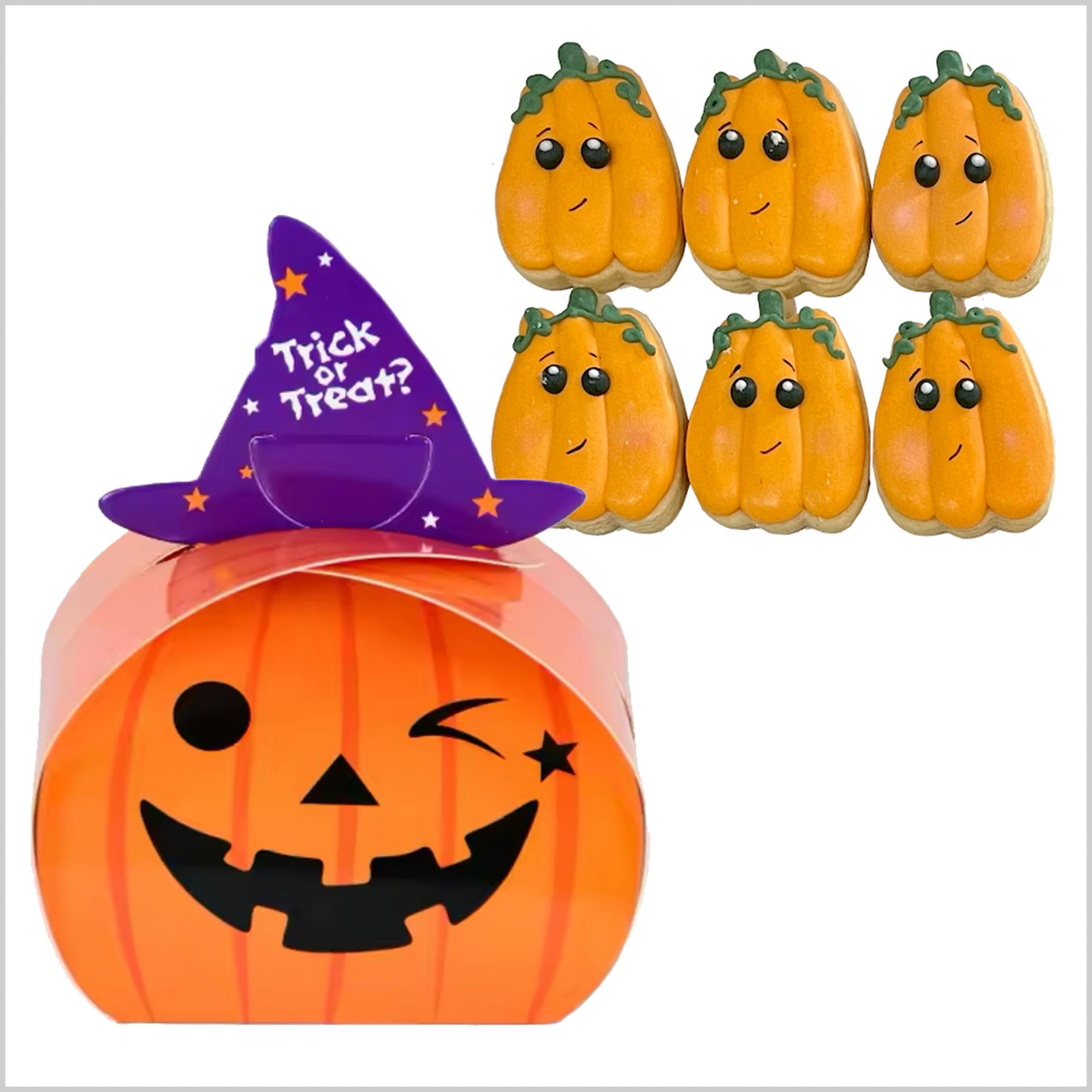 Caja en forma de calabaza de Halloween rellena con 6 mini calabazas decoradas con glasa real.