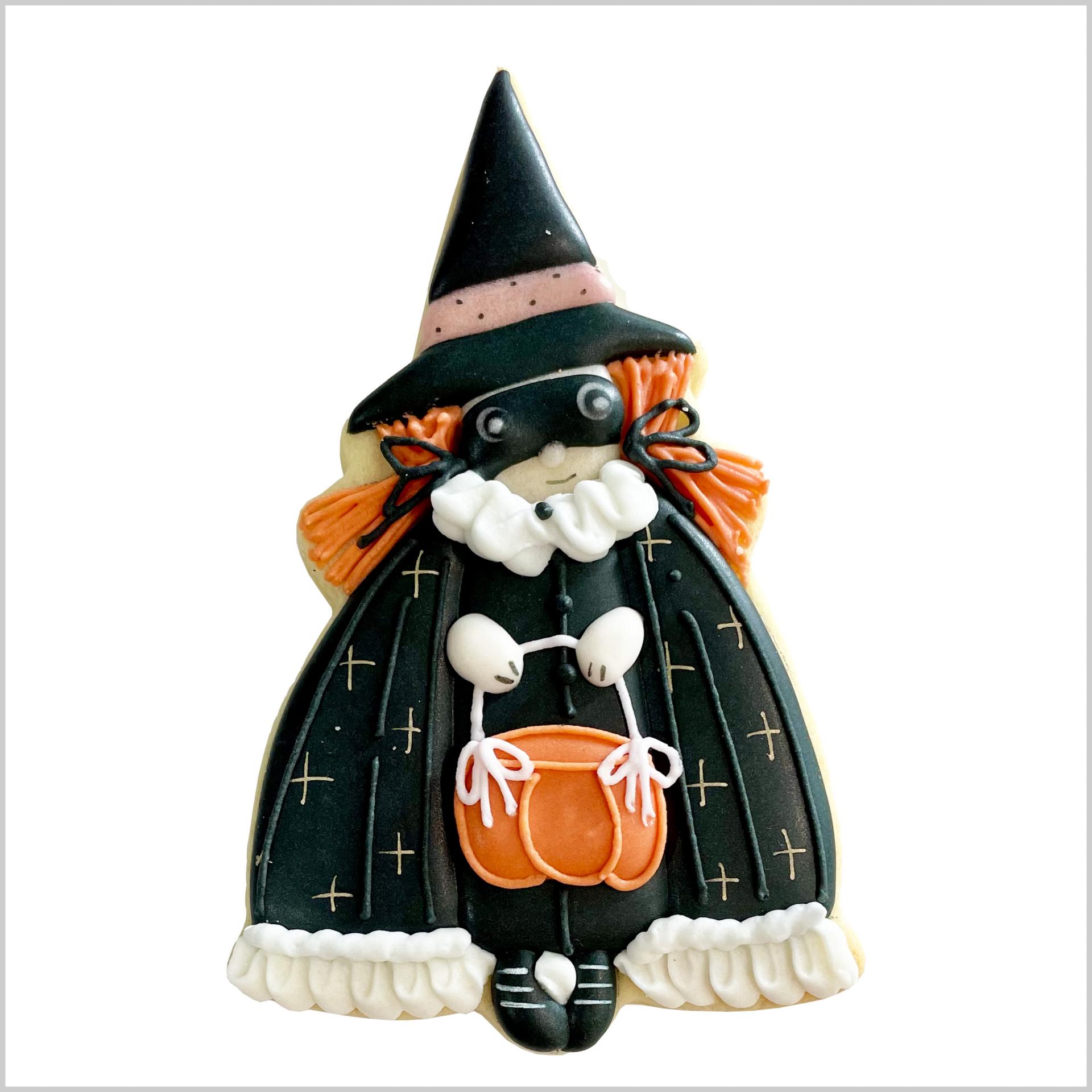 Galleta de mantequilla decorada con glasa real en forma de brujita.