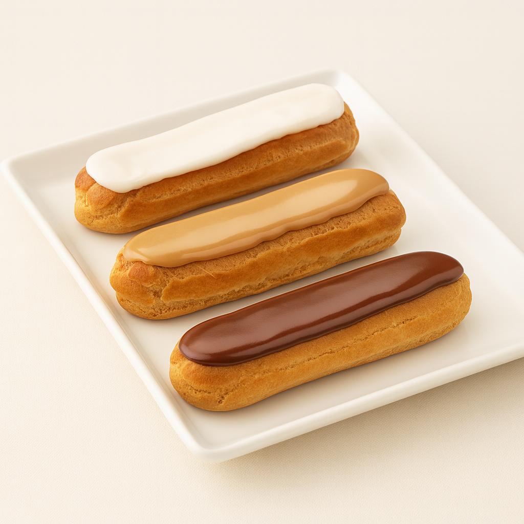 Éclair (deliciosa masa de choux) que rellenamos de 3 sabores distintos: