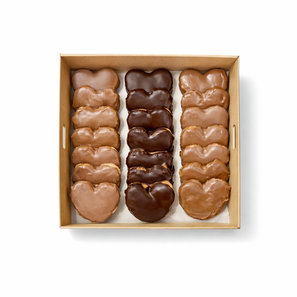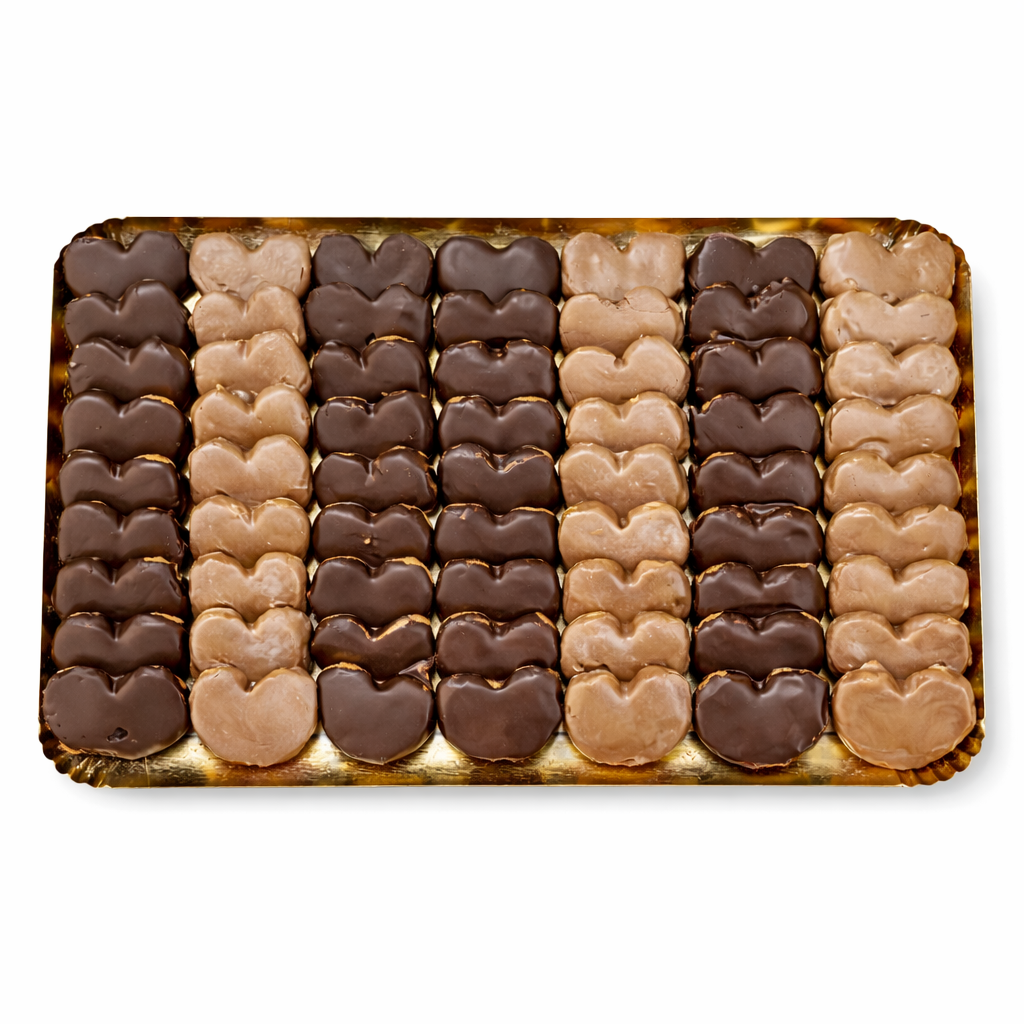 Bandeja de mini palmeritas bañadas en chocolate con leche y chocolate negro