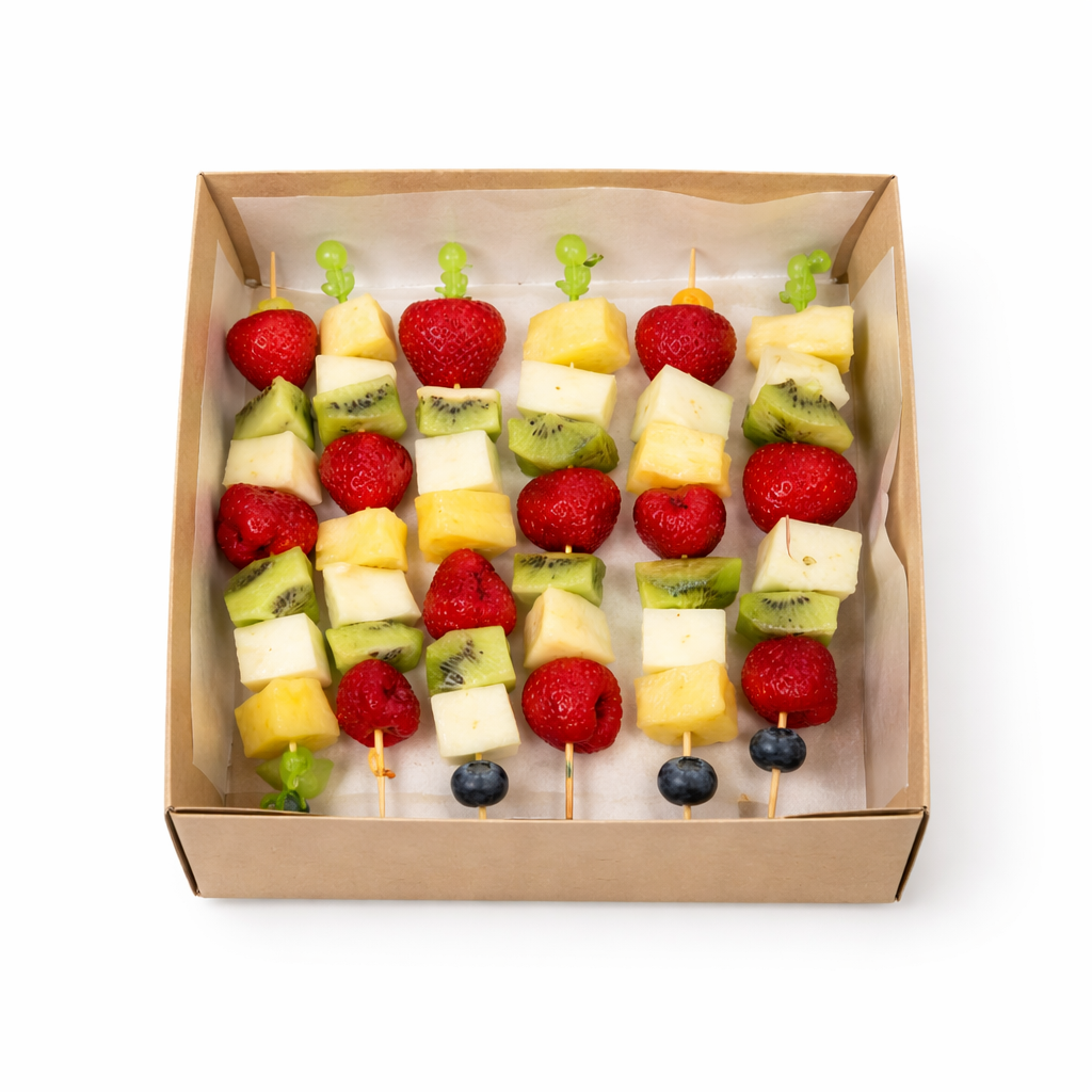 Bandeja de brochetas de frutas de temporada. Una opción saludable para acompañar una comida o picoteo en casa o en la oficina.