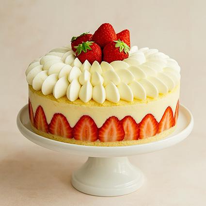 Tarta elaborada con 2 capas de bizcocho genovés, relleno de fresas, crema muselina, nata y más fresas frescas.