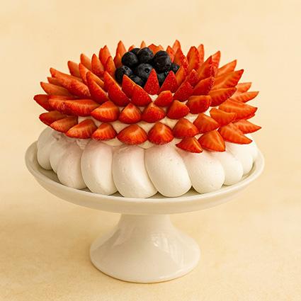 Tarta elaborada con una base de merengue y rellena de nata, decorada con frutos rojos.