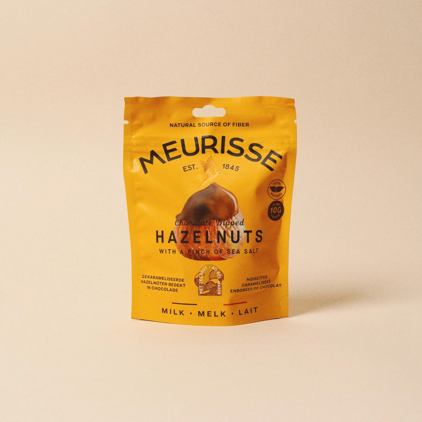 Avellanas caramelizadas bañadas en una fina capa de chocolate con leche con una pizca de sal.