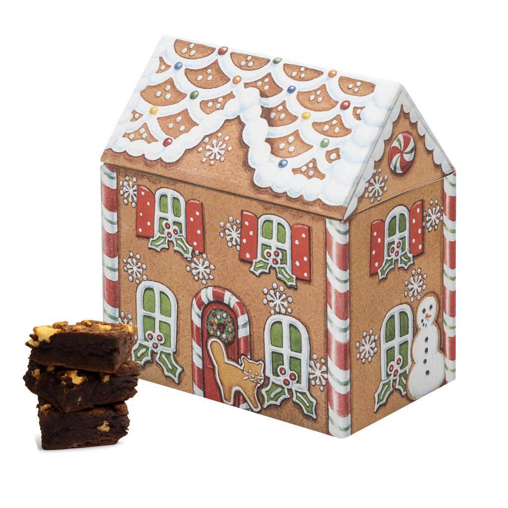 Caja de latón en forma de casita de jengibre que hemos rellenado con una bolsita de 180 gr. de nuestros deliciosos brownies artesanos.