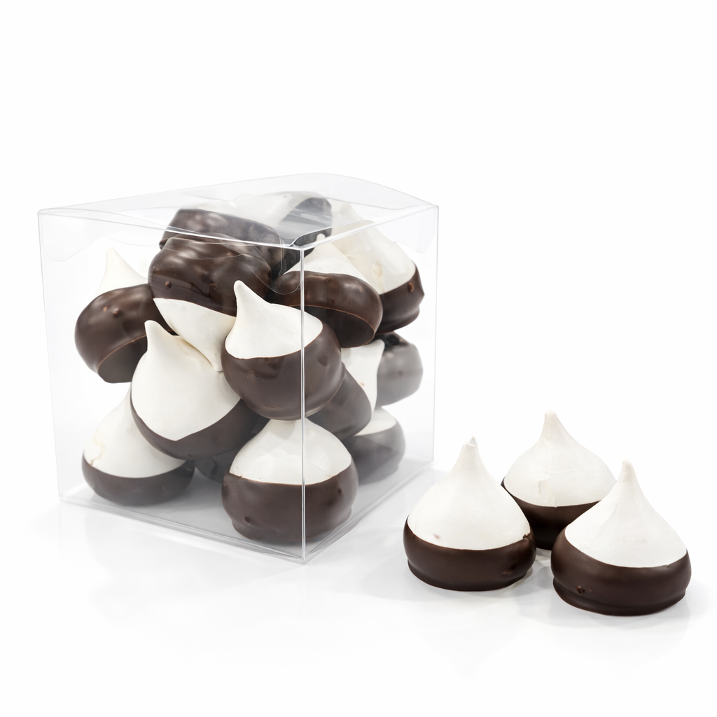 Merenguitos bañados en chocolate presentados en una cajita transparente.