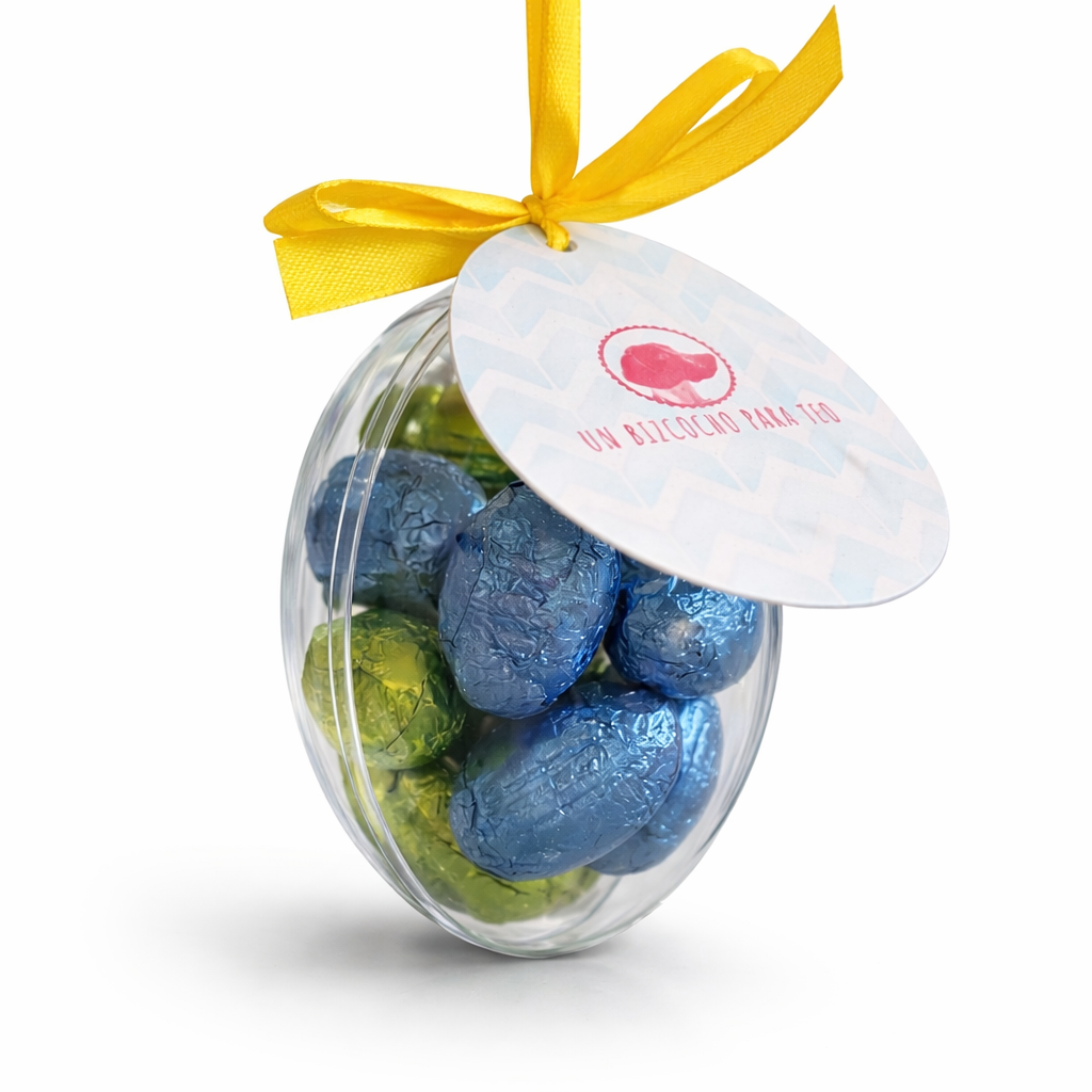 Vienen presentados en una cajita en forma de huevo decorado con nuestra etiqueta especial para Pascua
