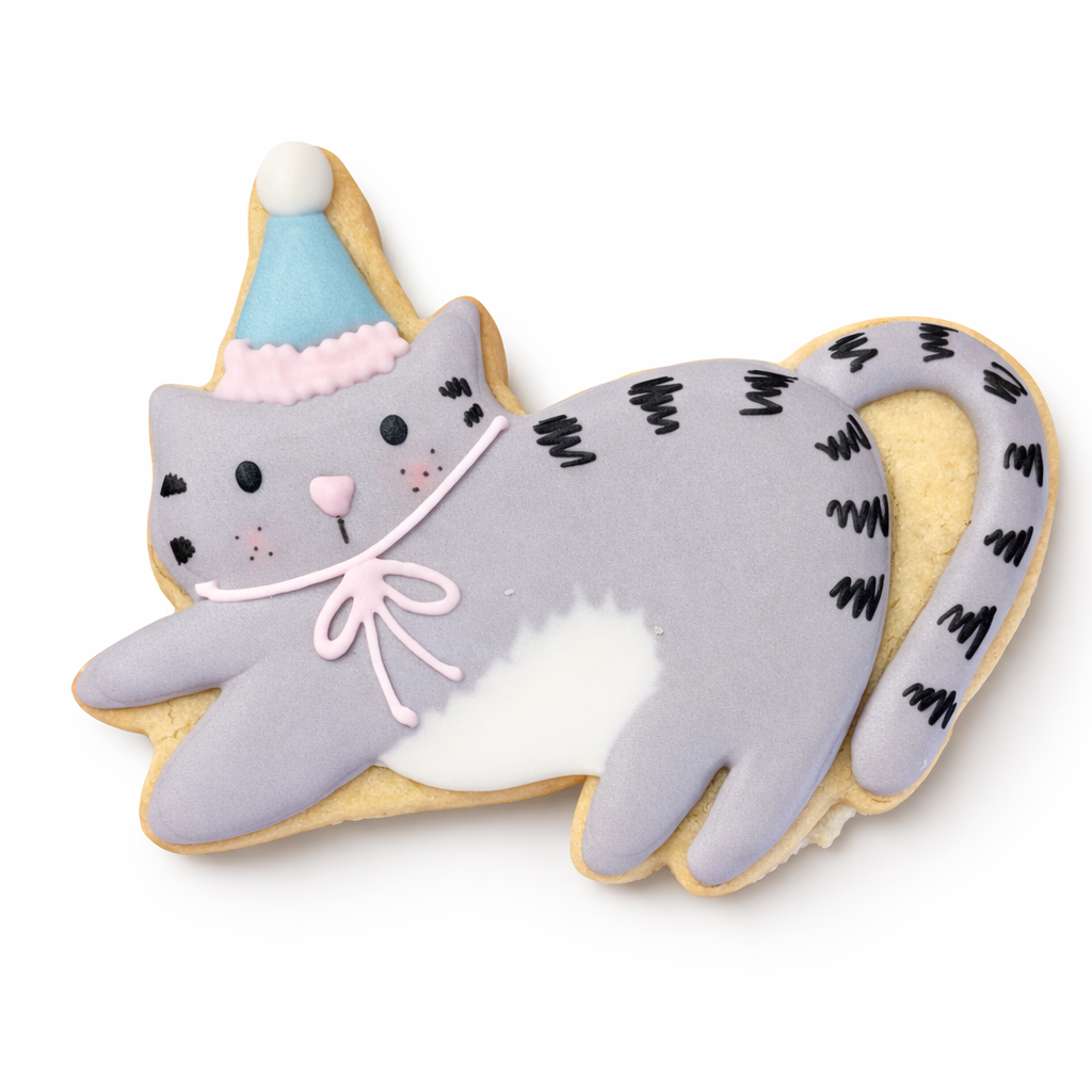 Galleta de mantequilla decorada con glasa real en forma de un gatito