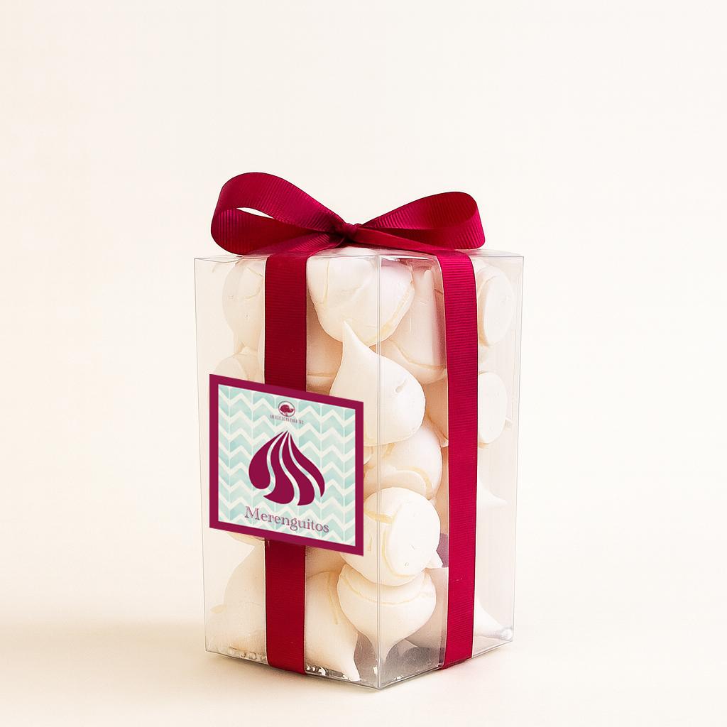 Caja de merenguitos presentados en una cajita transparente y decorados con un lazo de regalo.