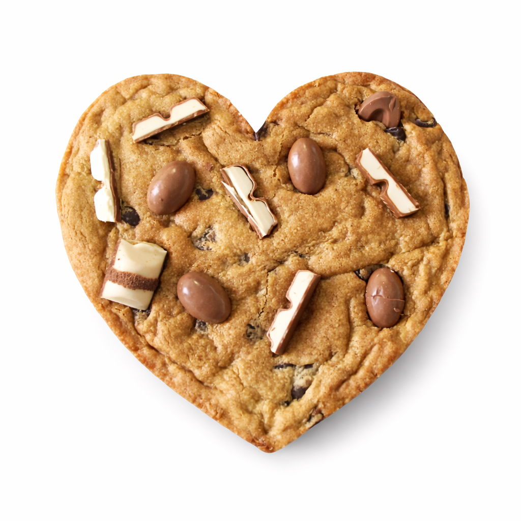 Deliciosa y gigantesca galleta artesana de chocolate con forma de corazón decorada con chocolate Valrhona, kínder chocolate, kínder bueno y huevitos Schoko Bons