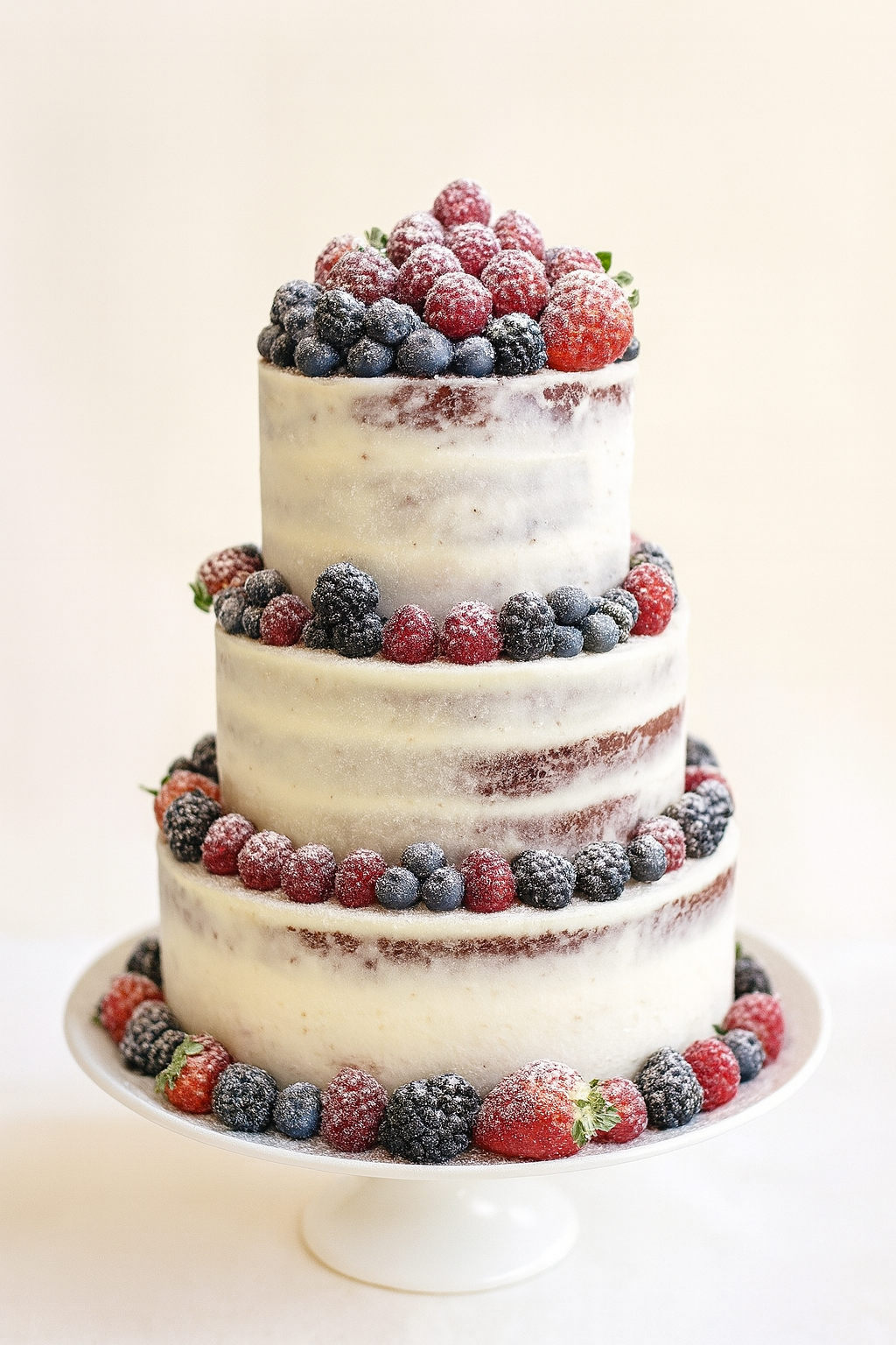 Tarta elaborada con seis capas de bizcocho de Victoria Sponge formando una tarta de 3 pisos. Está rellena de una crema ligerísima de queso y decorada con frutos rojos.