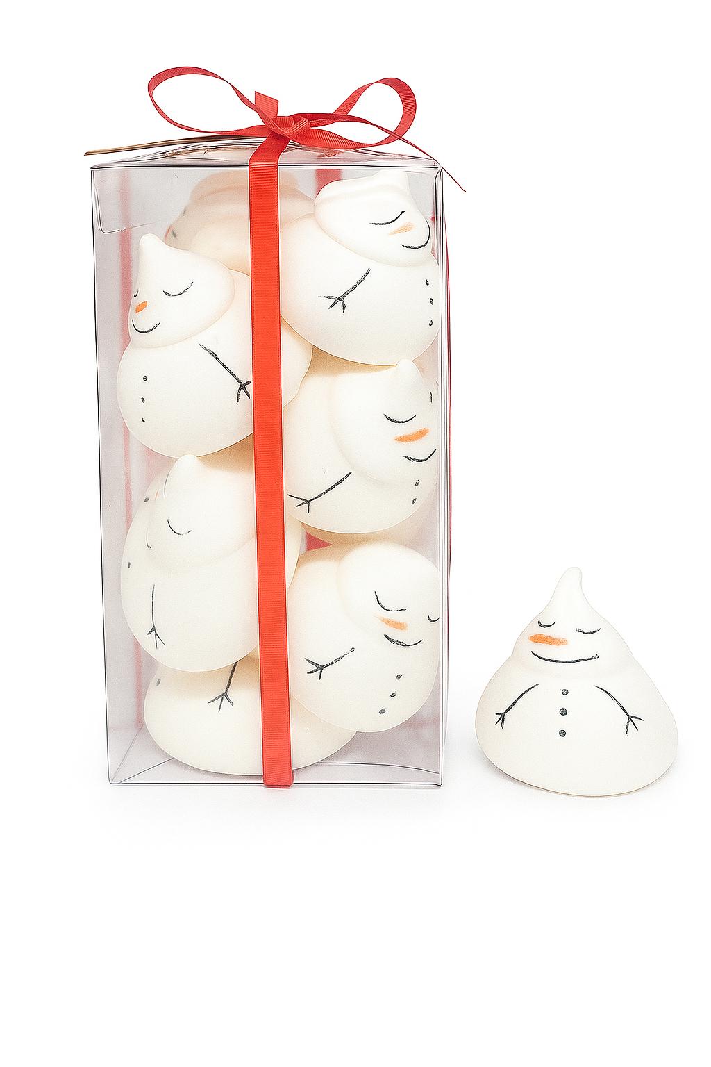 Caja de merenguitos con forma de muñeco de nieve presentados en una caja transparente y decorados con un lazo de regalo.